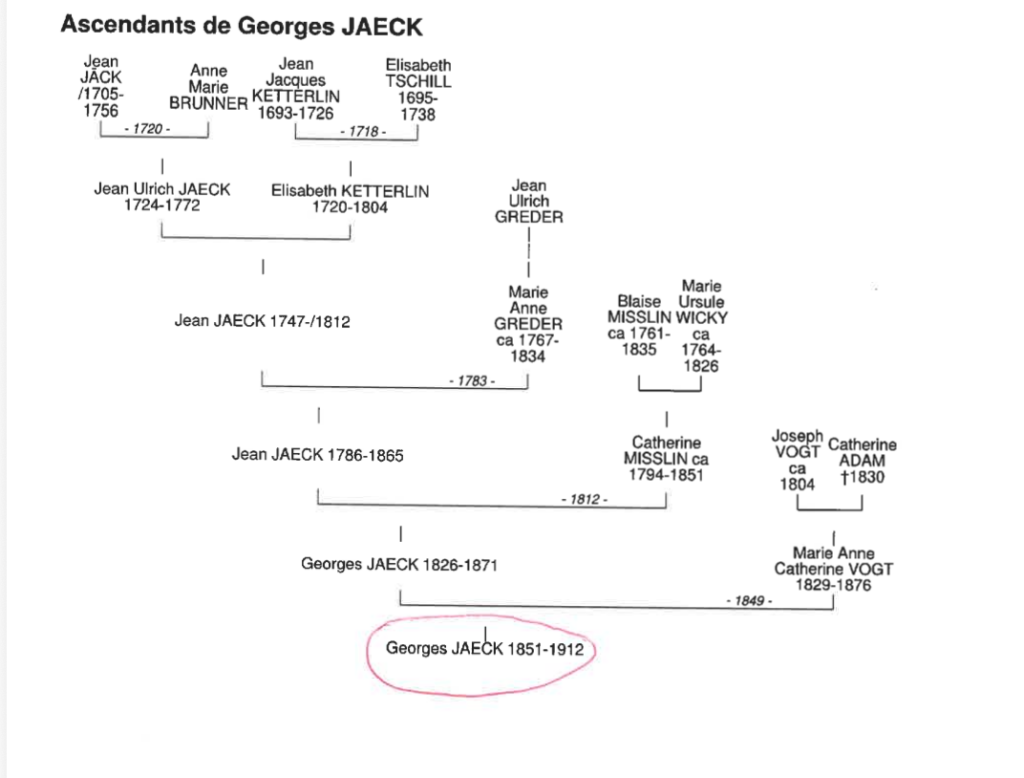 Georges JAECK (né le 6 septembre 1826 à Hégenheim) + Catherine VOGT (née le 2 octobre 1829) mariés le 6 novembre 1848, 9 enfants dont Georges JAECK (et Theodore Jaeck un de ses frères et grand père de Claude)