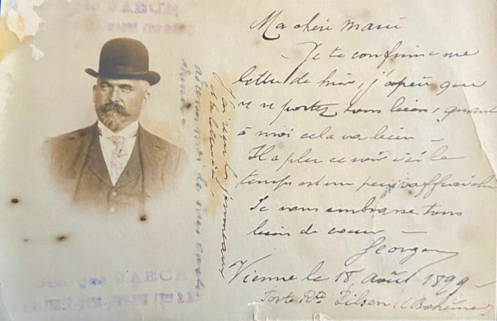 Carte postale recto-verso ( avec la photo de Georges Jaeck) envoyé à son épouse Marie-Sophie, vraisemblablement écrite à Vienne et postée à Pilsen en Bohème et adressée à lui-même